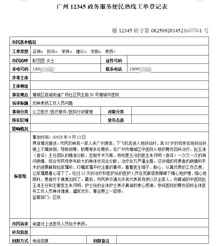 “真的太感谢广州市增城区中医医院的医护人员了!在陌生的城市,是他们用专业和爱心,让我母亲感受到了生命的尊严与温度。”近日,广州 12345 政务服务便民热线接到了市民散女士(化名)的表扬来电,电话里,她满是感激地讲述着83 岁母亲在广州市增城区中医医院得到悉心救治与护理的暖心经历。